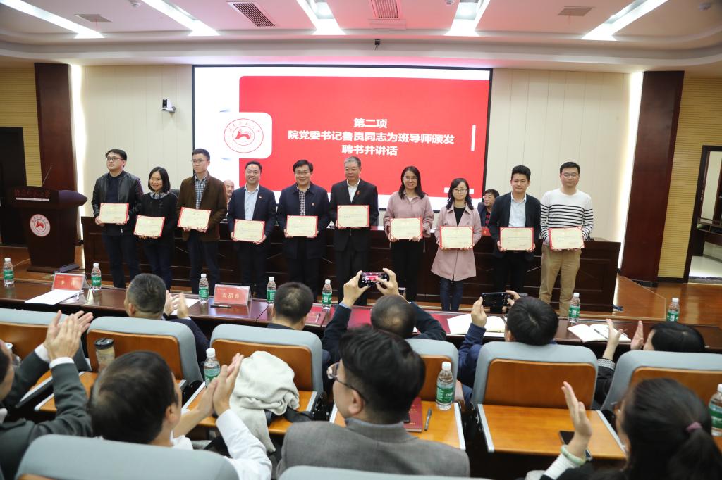 公司党委书记鲁良为全体班导师颁发聘书并讲话。他代表公司以及正在外地出差的王兆峰经理感谢周俊武副董事长、向发意部长等老师担任公司的班导师,并以把关爱员工内化为信仰信念、把三全育人实化为办法举措、把青春梦想转化为定力动力与在场师生共勉。