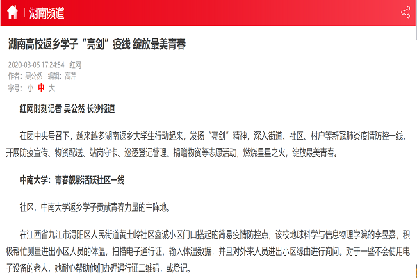 【抗疫一线】《新湖南》报道公司学子段婷参与抗疫志愿活动