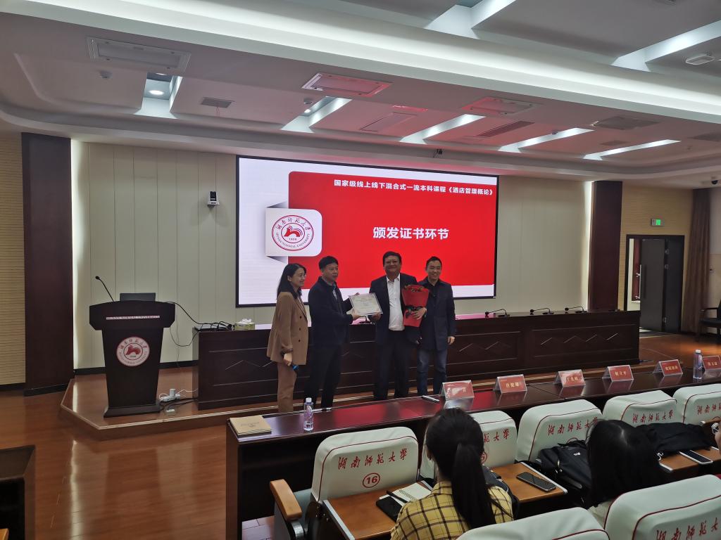 启动仪式上,王兆峰经理和酒店管理系主任唐健雄教授代表公司为三位导师颁发了《酒店管理概论》课程校外企业导师证书。