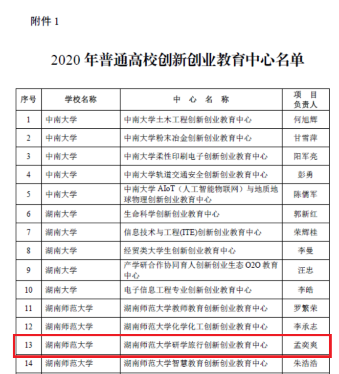 12月10日,湖南省教育厅发布了《关于公布2020年普通高校创新创业教育中心和校企合作创新创业教育基地认定结果的通知》(湘教通〔2020]301号),经各校前期建设申报,省教育厅组织专家审核,2020年全省共认定106个创新创业教育中心和93个校企合作创新创业教育基地,由公司孟奕爽副教授负责的vsport胜利因您更精彩研学旅行创新创业教育中心获得省级认定。