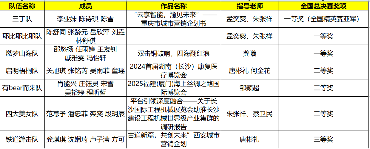其中,由公司孟奕爽和朱张祥两位老师的共同指导,2021级会展经济与管理专业本科生李业妹、陈诗琪、陈雪共同完成的参赛项目《“云享智能,渝见未来”重庆市城市营销》经过初赛、复赛(省赛)、全国总决赛分组赛的层层选拔与淘汰,顺利晋级精英赛。并于11月26日举办的精英赛中荣获全国总决赛亚军,同时入围代表中国赴新加坡参加2024年国际商务会展策划大赛资格。