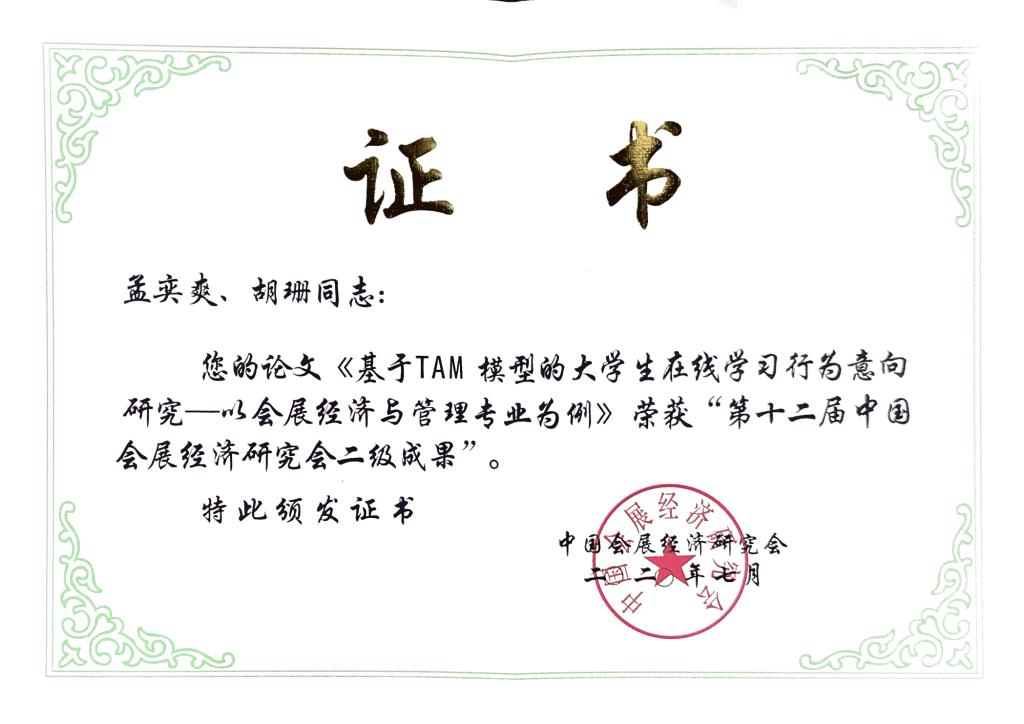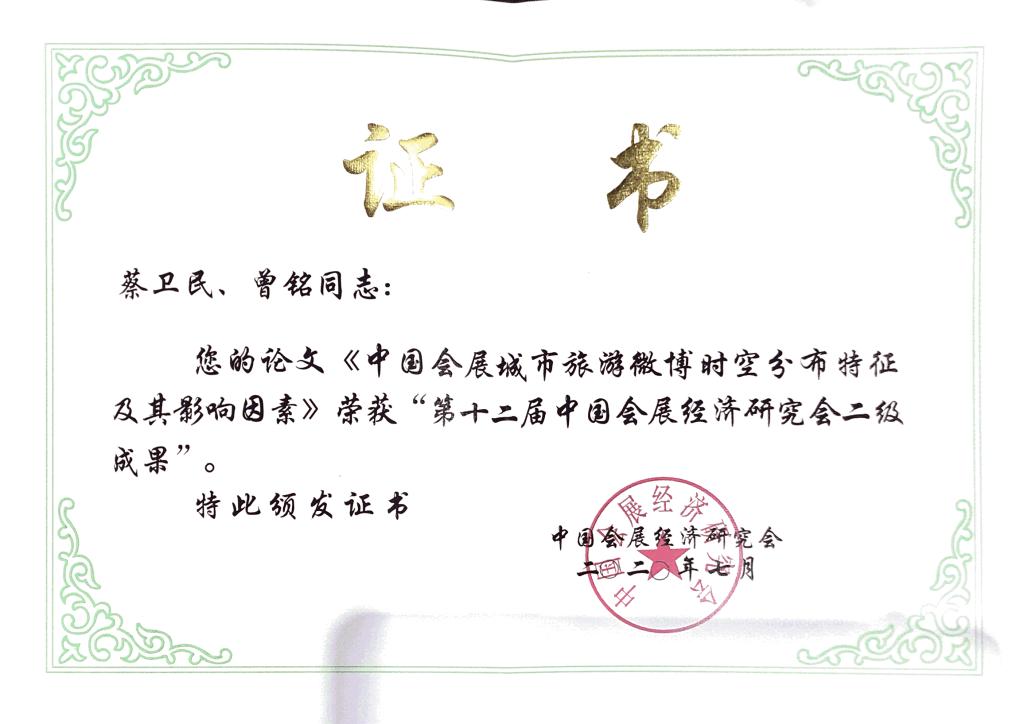 在中国会展教育论坛中,孟奕爽作为嘉宾分享了vsport胜利因您更精彩会展经济与管理专业建设经验。会议期间发布了2019中国展览与会议统计数据、中国会展经济最新研究成果及《2020 中国会展经济研究会年会学术论文、抗疫征文、专选网文特集》等。蔡卫民、汪晶晶撰写的学术论文《基于CiteSpace的国内会展经济研究可视化分析》入选年会论文集。蔡卫民、曾鸣的论文《中国会展城市旅游微博时空分布特征及影响因素》和孟奕爽、胡珊的论文《基于TAM模型的老员工在线学习行为意向研究——以会展经济与管理专业为例》分别荣获“第十二届中国会展经济研究会二级成果”奖项。