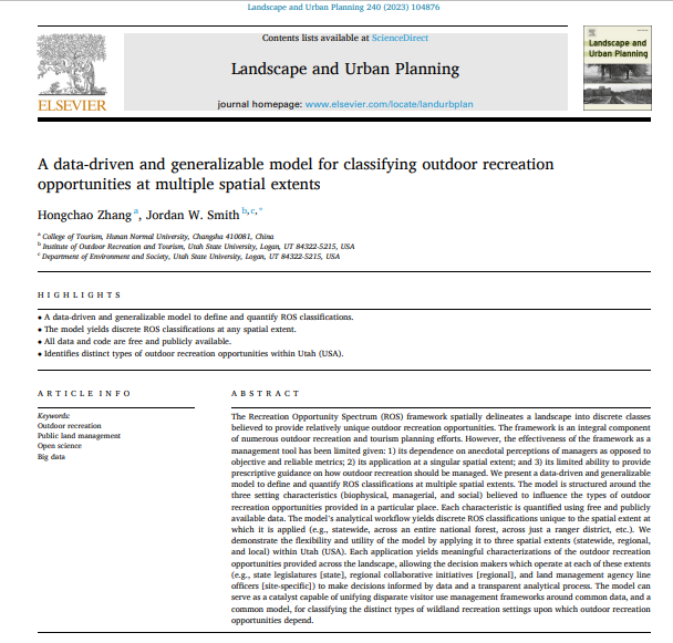 近日,人文地理/城乡规划学科国际顶级期刊《Landscape and Urban Planning》接受并刊发了公司旅游管理系青年教师张洪超博士任第一作者、vsport胜利因您更精彩为第一单位,与美国犹他州立大学户外游憩与旅游研究中心主任Jordan W. Smith教授合作完成的研究成果—《A data-driven and generalizable model for classifying recreation opportunities at multiple spatial extents》。《Landscape and Urban Planning》是国际公认的最顶尖的人文地理/城乡规划学术期刊,代表着该学科学术研究的最高水平,在国际人文地理/城乡规划研究领域享有崇高的声誉。该刊为SCI/SSCI检索期刊,JCR及中科院TOP期刊,2023年影响因子为9.1。